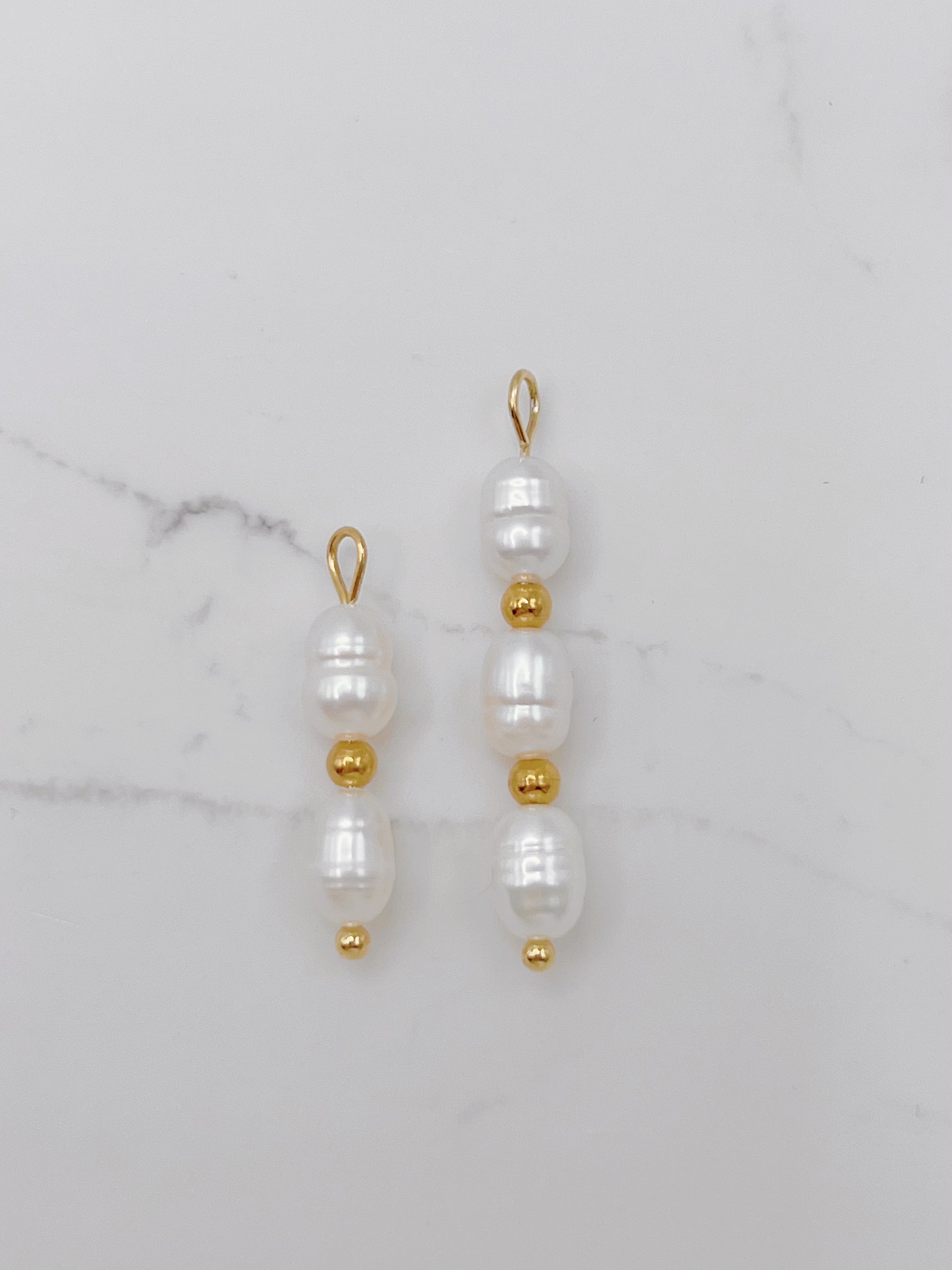 Triple pearl: gold plated stainless steel bead, freshwater pearl. Measurement: approx. 30mm length, approx. 5mm width pearl.
